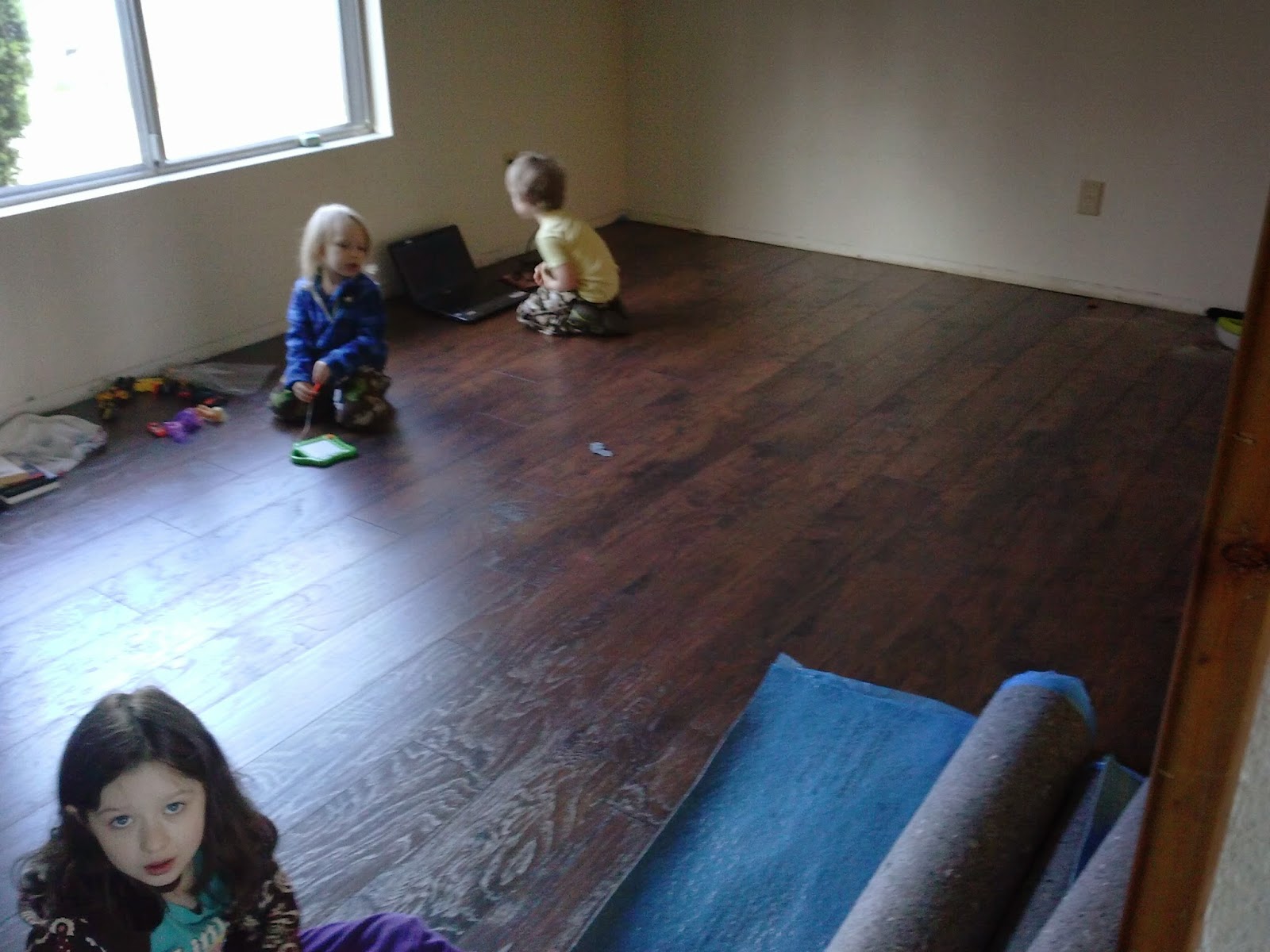 We didn't take a lot of pictures while we were working, mainly because we were focused on working...So mainly I'm posting the finished (or mostly finished) project. We still need to do the baseboards, dividers, and do some trimming on the underlayment.